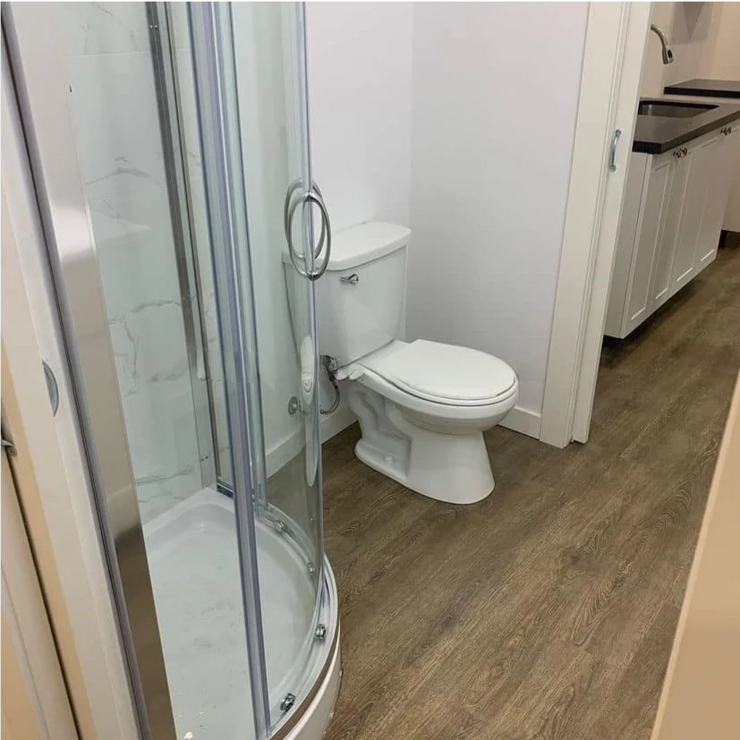 Description: A portable, modular, and eco-friendly tiny house made from a shipping container, perfect for adults, with a toilet, kitchen, and bathroom.